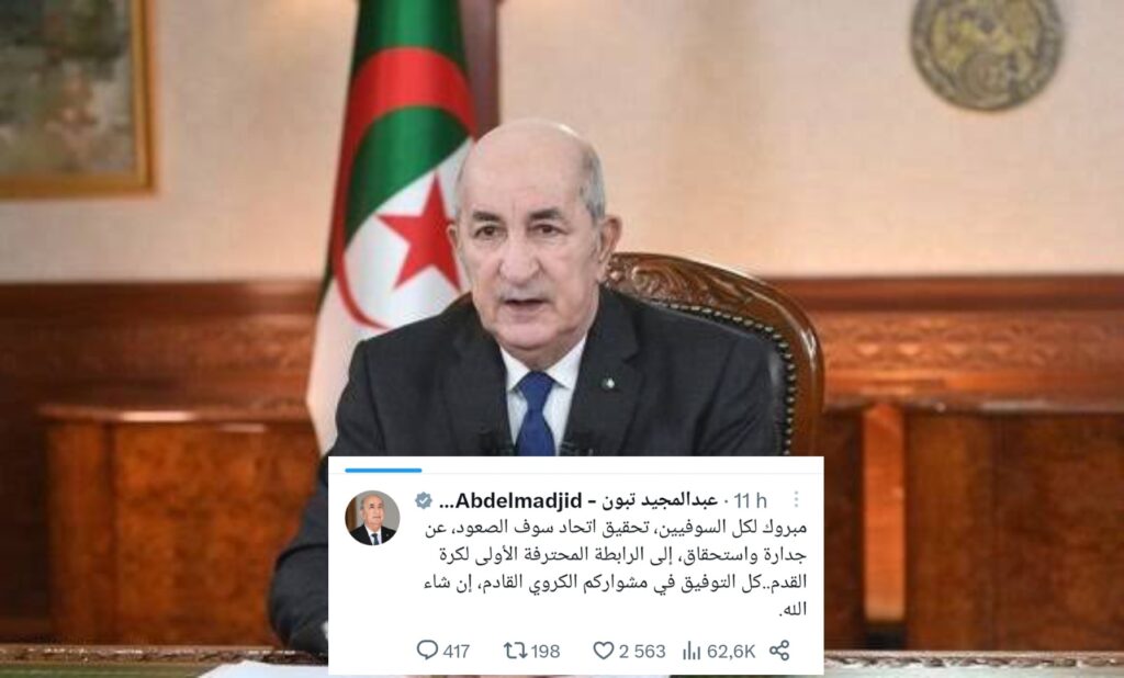 كما قال رئيس الجمهورية عبد المجيد تبون عبر صفحته الرسمية على “تويتر”، اليوم الثلاثاء “مبروك لكل السوفيين، تحقيق اتحاد سوف الصعود، عن جدارة واستحقاق، إلى الرابطة المحترفة الأولى لكرة القدم”.