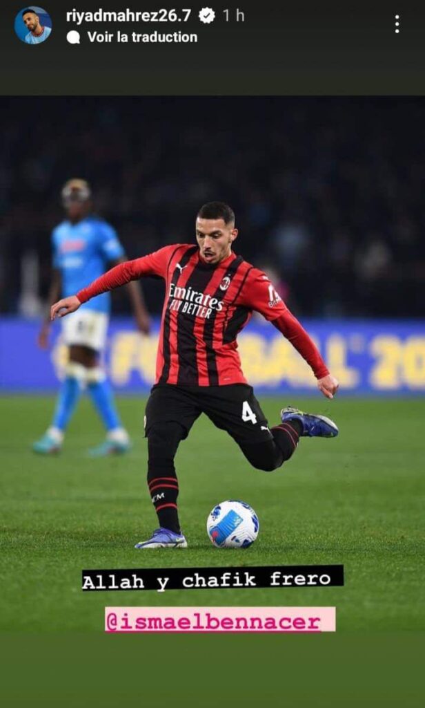 ونشر محرز، تغريدة عبر حسابه الرسمي على “انستغرام”، صورة لبن ناصر، بقميص الميلان، وعلق قائلا: “شفاك الله أخي اسماعيل بن ناصر”.