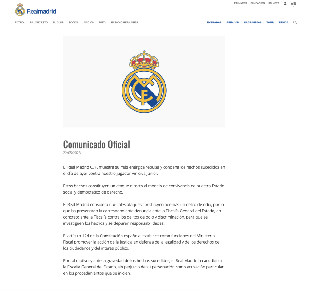نشر ريال مدريد بيان رسمي بشأن ما حدث للاعبه فينيسيوس في مواجهة فالنسيا يوم الأحد ضمن الدوري ، وجاء في بيان ريال مدريد “يرفض ريال مدريد بشدة ويدين الأحداث التي وقعت ضد اللاعب فينيسيوس ، مثل هذه الهجمات تشكل جريمة كراهية ولهذا السبب تقدمنا بشكوى إلى مكتب المدعي العام للدولة حتى يمكن التحقيق في الوقائع وتوضيح المسؤوليات”.