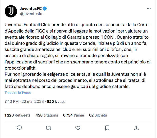 ردّ نادي جوفنتوس الإيطالي على قرار المحكمة الفيدرالية، بخصم 10 نقاط من رصيده في الدوري الإيطالي الموسم الجاري، وأصدر النادي الإيطالي بيانا عبر حسابه على تويتر، حيث قال: “نحتفظ بالحق في قراءة أسباب قرار محكمة الاستئناف بالاتحاد الإيطالي، لتقديم استئناف محتمل، مرارة كبيرة للنادي ولملايين المشجعين، الذين يجدون أنفسهم يتعرضون لعقوبات شديدة، يبدو أنها تأخذ في الاعتبار مبدأ التناسب”. وتابع البيان: “بينما لا نتجاهل الحاجة إلى الاستعجال، وهو الأمر الذي لم يبتعد عنه جوفنتوس أبدا خلال الإجراءات، تم التأكيد على أن هذه حقائق لا يزال يتعين تقييمها من قبل القاضي”.