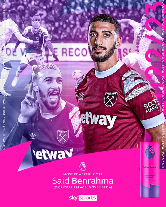 فاز مهاجم وست هام سعيد بن رحمة بجائزة أقوى هدف في الدوري الإنجليزي الممتاز للموسم 2022-2023، وتحصل الدولي الجزائري على الجائزة بفضل هدفه من تسديدة صاروخية أطلقها من خارج منطقة الجزاء هزت شباك حارس كريستال بالاس فيسينتي جوايتا، حيث بلغت سرعة التسديدة 107.17 كم في الساعة، وتأتي هاته الجائزة الرمزية لتؤكد الموسم المميز الذي بصم عليه الدولي الجزائري هذا الموسم مع ناديه ويست هام حيث وقع 11 هدفا في كل المنافسات هذا الموسم وقدم خمس تمريرات حاسمة في 51 مباراة خاضها مع “الهامرز”، وينتظرة لقاء نهائي دوري المؤتمر الأوروبي ليختتم به موسمه الرائع رغم التهميش الذي تعرض له بداية الموسم من طرف مدربه دافيد مويز.