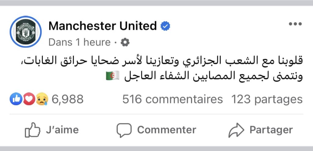 مانشستر يونايتد يتضامن مع ضحايا حرائق الجزائر