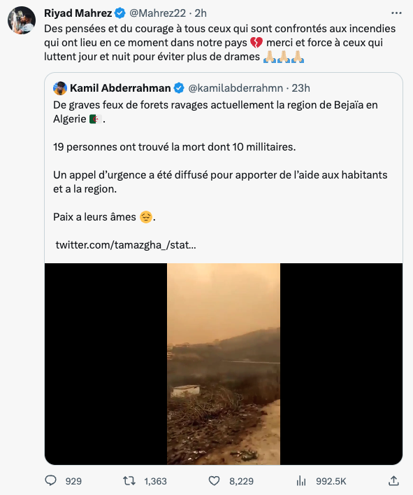 عبر النجم الجزائري رياض محرز عن حزنه وأسفه الشديد جراء حرائق الغابات التي مست الجزائر الإثنين… ونشر محرز عبر مواقع التواصل الاجتماعي « تويتر » فيديو الحرائق وكتب محرز : « القوة والشجاعة لكل من يواجه الحرائق التي تدور في بلادنا والمزيد من القوة والإرادة لمن يقاتل ليلا ونهارا لتجنب هذه المأساة »