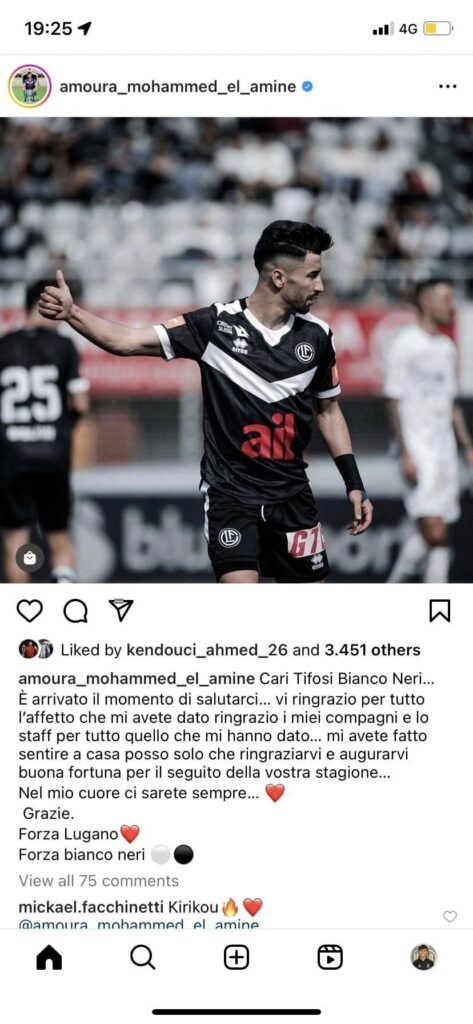كتب الدولي الجزائري محمد الأمين عمورة رسالة وداع لزملائه وكذا جماهير لوغانو وذلك عبر حسابه الرسمي على « إنستغرام »