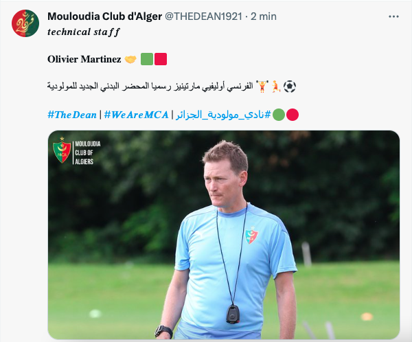 أعلن نادي مولودية الجزائر رسميا عن تعيين الفرنسي « أولييفي مارتينيز » محضرا بدنيا للفريق لموسم 2023/2024 .. وكان أوليفيي مارتينز قد ألتحق في وقت سابق مع المدرب « بوميل » لكنه عاد إلى فرنسا لاستكمال مهامه مع فريق « نيم ميديتيراني » لكرة اليد النسوية قبل أن يعود ويلتحق بالطاقم الفني للمولودية رسميا .