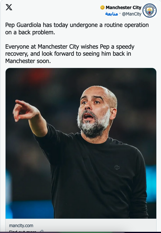 أعلن نادي مانشستر سيتي الثلاثاء أن المدرب الإسباني بيب غوارديولا سيغيب لـ3 أسابيع بسبب إجراءه لعملية جراحية على مستوى الظهر بمدينة برشلونة بإسبانيا و هي التي خاضها بعد معاناته من الام شديدة في الأونة الأخيرة.. يذكر أن العملية الجراحية كانت ناجحة و إلى غاية عودة غوارديولا إلى فريقه سيشرف مساعد المدير الفني خوان مانويل ليو على تدريب السيتيزن