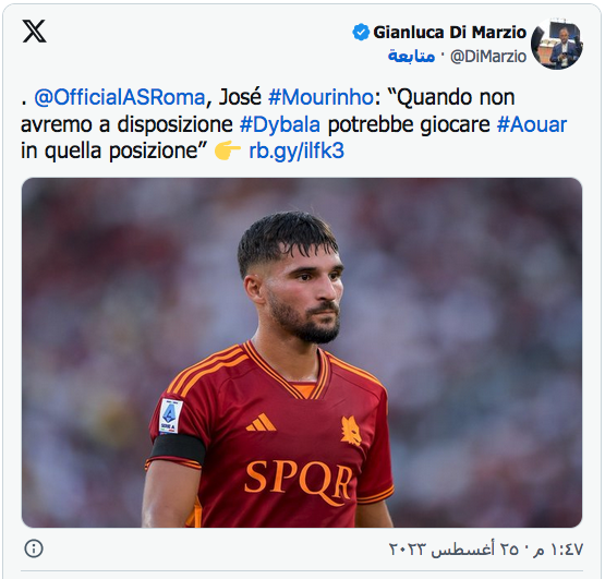 أكد “جوزي مورينيو”، في ندوة صحفية نشطها،الجمعة ،قبل مباراة نادي روما أمام”هيلاس فيرونا”…ضمن الجولة 2 من” السيري أ “،أن الدولي الجزائري حسام عوار يمكنه تولي منصب مهاجم متقدم في حال غياب الدولي الأرجنتيني”باولو ديبالا”…وجاء هذا في تصريحات نقلها موقع “بازي دي فانتا” الإيطالي…حيث قال “السبيشل وان”: “اليوم الذي لن يكون بإمكاننا الإستفادة من ديبالا يمكن أن نشرك بيليغريني أو عوار في مركز متقدم ” .