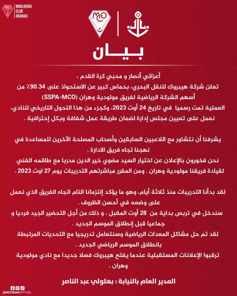 بدأت بوادر حل الأزمة في بيت مولودية وهران في الظهور بعد أيام عصيبة مرت على الحمراوة… حيث كشفت شركة هيبروك المالك الجديد للفريق…. كشفت في بيان رسمي وعلى لسان المدير العام بالنيابة عبد الناصر بهلولي عن تعيينها المدرب خير الدين مضوي رسميا على رأس العارضة الفنية للفريق في الموسم الجديد… حيث سيشرع في مهامه هذا الأحد على أن ينطلق تربص الفريق التحضيري للموسم الجديد يوم الإثنين بمركب ميلود هدفي… حيث اقتنع التقني السطايفي بالعرض بعد تلقيه ضمانات من طرف المالك الجديد للفريق… هذا وكشفت هيبروك في بيانها أنها رسمت استحواذها على 90.34 من أسهم الشركة يوم الخميس فقط … مضيفة أنها تعمل على تعيين مجلس الإدارة الجديد وتعهدت بوضع النادي الوهراني في أفضل الظروف وتسييره بطريقة احترافية.