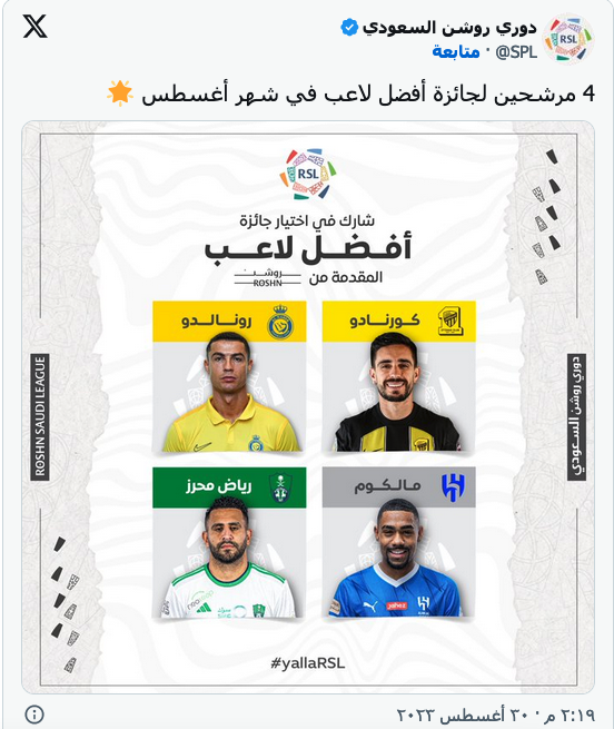 نشر الحساب الرسمي لدوري روشن السعودي قائمة اللاعبين المرشحين للفوز بجائزة أفضل لاعب في شهر أوت  بدوري روشن السعودي.. إذ جاء اسم الدولي الجزائري و قائد الخضر رياض محرز على رأسها  منافسا لكريستيانو رونالدو لاعب النصر، مالكوم  وكورنادو لاعبا الهلال والإتحاد على التوالي … للإشارة فإن محرز بصم على بداية مميزة في الدوري السعودي بعد أن سجل هدفين وصنع أخرين في الأربع الجولات الأولى.