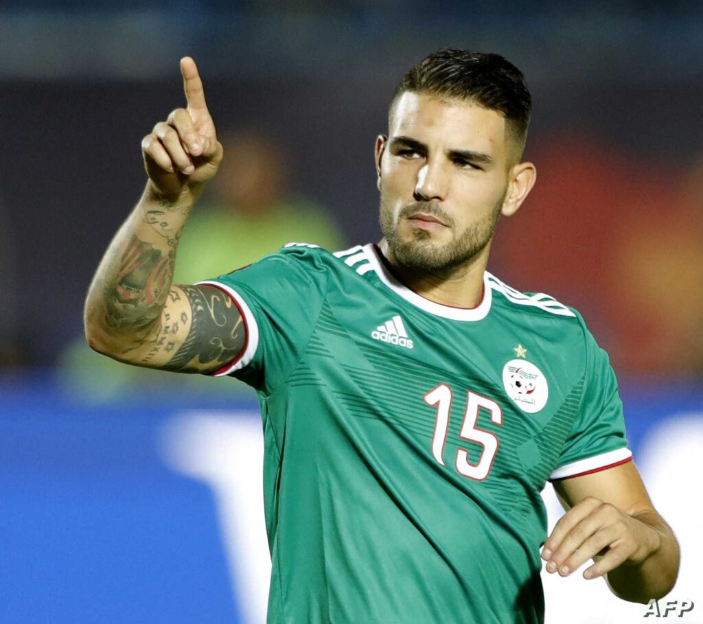 Algeria’s forward Andy Delort celebrates after scoring during the penalty shootout of the 2019 Africa Cup of Nations (CAN) quarter final football match between Ivory Coast and Algeria at the Suez stadium in Suez on July 11, 2019. (Photo by FADEL SENNA / AFP)
