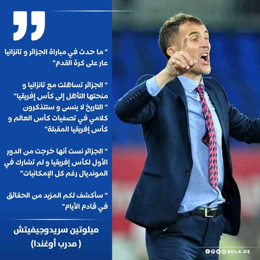 لم يترجع الصربي “ميلوتين سريدوجيفيتش” مدرب منتخب أوغندا، فشل أشباله في التأهل إلى “كان” كوت ديفوار، رغم الفوز المحقق خارج القواعد أمام النيجر في ختام التصفيات، المدرب الصربي لمنتخب أوغندا، لم يجد أفضل من الجزائر لتبرير اخفاقه، بعدما اتهم المنتخب الوطني بتسهيل مهمة منتخب تنزانيا، الذي فرض التعادل أمام الخضر، مؤكدا إن نتيجة اللقاء مشكوك فيها، واصفا ما حدث بملعب التاسع عشر ماي بـ عنابة بالعار، ونفث المدرب الصربي سمومه على الخضر، حين توقع فشل الخضر اقصاء الخضر من الدور الأول من نهائيات أمم افريقيا المقبلة، متوعدا بكشف حقائق مثيرة في قادم الإيام.