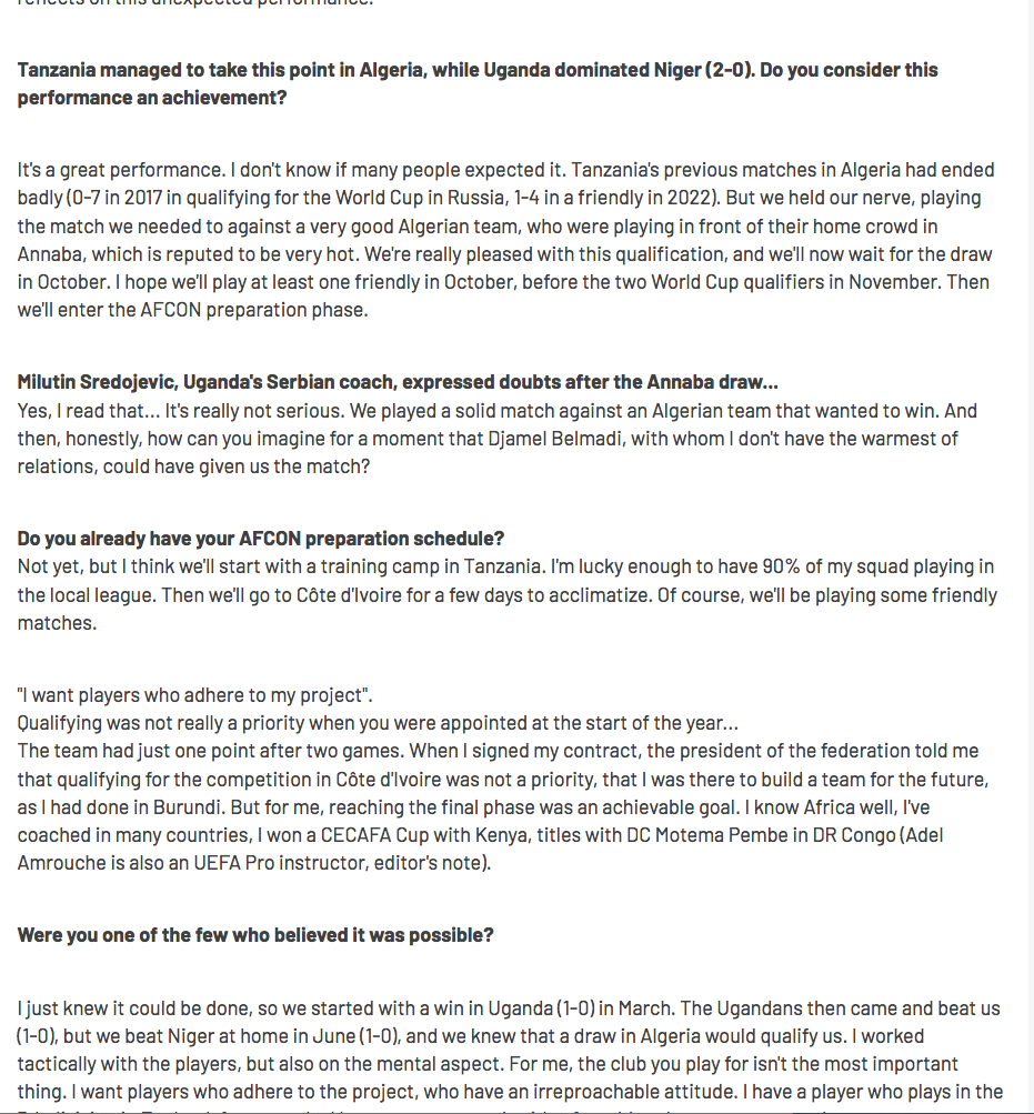 تفاجأ التقني الجزائري عادل عمروش، الذي نجح في قيادة منتخب تنزانيا لتأهل تاريخي إلى نهائيات أمم إفريقيا المقررة بـ كوت ديفوار، مطلع السنة المقبلة، تفاجأ باتهامات الصربي “ميلتون سيردوفيتس” مدرب منتخب أوغندا، الذي اتهم الجزائر وتنزانيا، بترتيب نتيجة مباراة الجولة الأخيرة من التصفيات، التي حسمها التعادل السلبي بملعب 19 ماي بـ عنابة، وفند عمروش كل الاتهامات، التي وجهها مدرب أوغندا، بالتأكيد أن تأكل تنزانيا إلى “الكان” أكثر من مستحق، خصوصا بعد المباراة البطولية لأشباله أمام الخضر، مبديا في نفس الوقت استغرابه الشديد مما جاء على لسان مدرب أوغندا، لما أكد عمروش أن علاقته غير جيدة مع بلماضي، ولا يمكن بأي حال من الأحوال، أن يتفق معه على ترتيب نتيجة اللقاء.