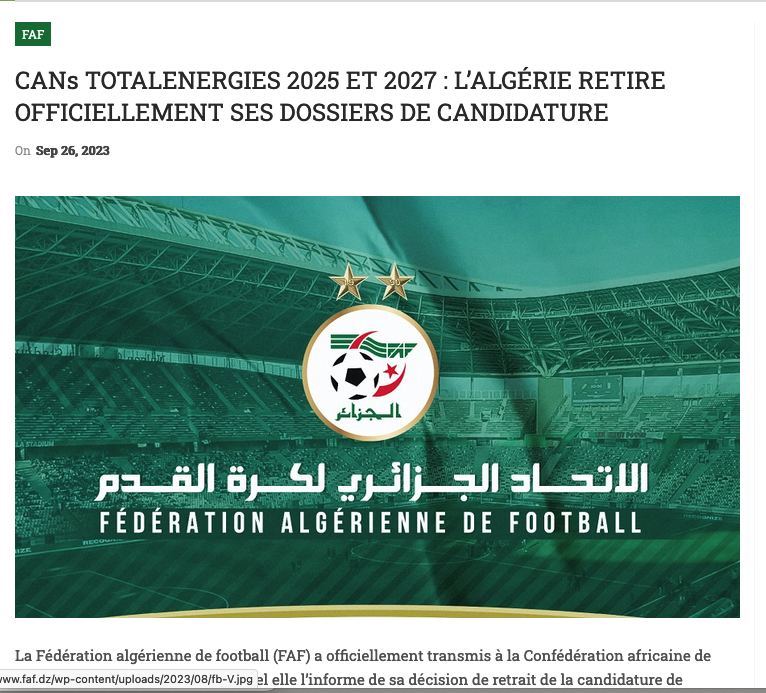 كشف الاتحادية الجزائرية لكرة القدم في بيان رسمي لها الأسباب التي دفعتها لاتخاذ قرار الإنسحاب من احتضان بطولتي كأس أمم إفريقيا 2025 و2027، وأكدت  “الفاف” أن الانسحاب يأتي بسبب النهج الجديد الذي تتبعه الفاف في استراتيجية تطوير كرة القدم في الجزائر، وأن “الفاف” ستركز جهودها مستقبلا لإعادة تنظيم كرة القدم الجزائرية، وأضافت الفاف في بيانها أنها لازالت ملتزمة بالمشاركة في تطوير كرة القدم الإفريقية، موجهة الشكر لكل الأسرة الإفريقية على تفهمها اتجاه هذا القرار.