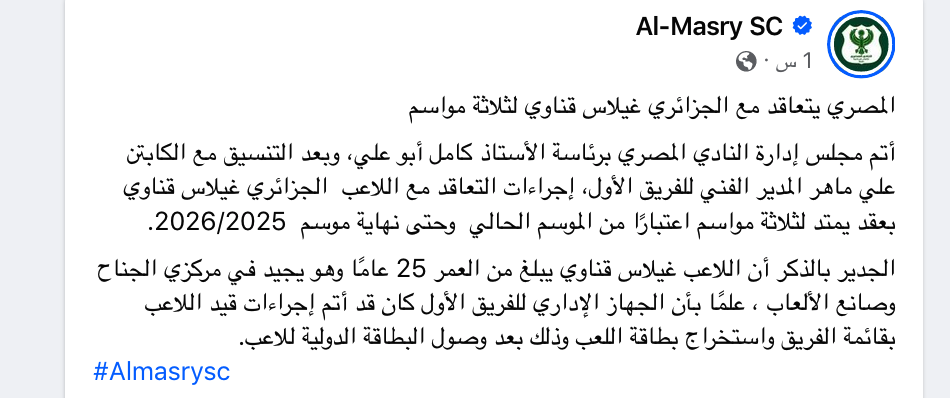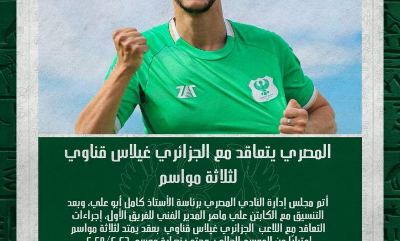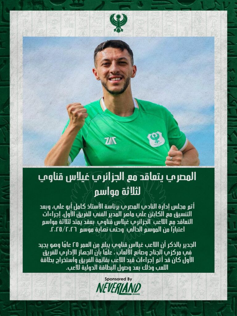بالفيديو … أعلن النادي المصري البورسعيدي ضم اللاعب الجزائري غيلاس قناوي بعقد يمتد لثلاثة مواسم اعتبارا من الموسم الحالي وحتى نهاية موسم 2026/2025… جدير بالذكر أن اللاعب غيلاس قناوي يبلغ من العمر 25 عاما وهو يجيد اللعب في مركزي الجناح وصانع الألعاب علما بأن الطاقم الإداري للفريق الأول كان قد أتم إجراءات اضافة اللاعب الى قائمة الفريق واستخراج بطاقة اللعب وذلك بعد وصول البطاقة الدولية للاعب.