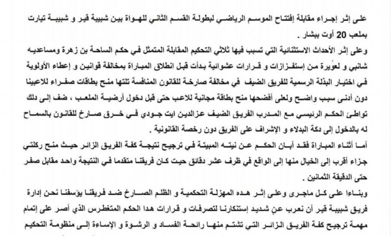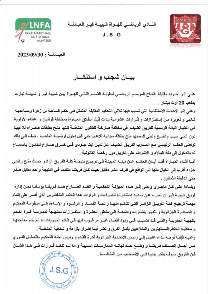 نشر نادي قير مبادلة الناشط في الدرجة الثانية هواة مجموعة وسط غرب بيانا رسميا، ندد فيها بكل ما حدث في لقاء فريقه أمام ضيفه شبيبة تيارت برسم الجولة الأولى للرابطة الثانية للهواة…بيان ممثل الجنوب الغربي أكد بأن حكم المباراة احتسب ركلتي جزاء من وحي الخيال حسبهم لمصلحة شبيبة تيارت تمكنوا على إثرهما من قلب نتيجة المباراة خلال آخر الدقائق، ووصفت إدارة قير عبادلة بالمتغطرس واتهمته بالفساد والرشورة، كما اضاف البيان أيضا بأن الحكام ومحافظ المباراة سمحوا لمدرب الزرقاء آيت جودي بالجلوس في كرسي الاحتياط رغم عدم إمتلاك الأخير للإجازة القانونية.