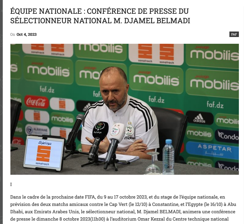 يعقد الناخب الوطني جمال بلماضي ندوة صحفية يوم الأحد المقبل الثامن أكتوبر تمهيدا للمباراتين الوديتين المرتقبتين لـ”الخضر” أمام منتخبي الرأس الأخضر ومصر في ملعبي “الشهيد حملاوي” بقسنطينة وملعب “هزاع بن زايد” بالإمارات على التوالي، وستعقد الندوة الصحفية لجمال بلماضي يوم الأحد بدأ من الساعة 11 صباحا بقاعد الندوات عمر غزال في المركز التقني الوطني بسيدي موسى.