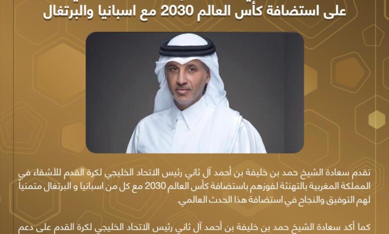 تقدم سعادة الشيخ حمد بن خليفة بن أحمد آل ثاني رئيس الاتحاد الخليجي لكرة القدم للاشقاء في المملكة المغربية بالتهنئة لفوزهم باستضافة كاس العالم 2030 مع كلاً من اسبانيا و البرتغال متمنياً لهم التوفيق والنجاح في استضافة هذا الحدث العالمي .
