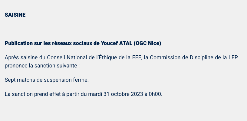 لجنة الإنضباط التابعة للرابطة الفرنسية تعاقب عطال بسبع مباريات كاملة إثر منشوره عبر المنصة الإلكترونية ” X ” الذي دعم فيه الفلسطينيين