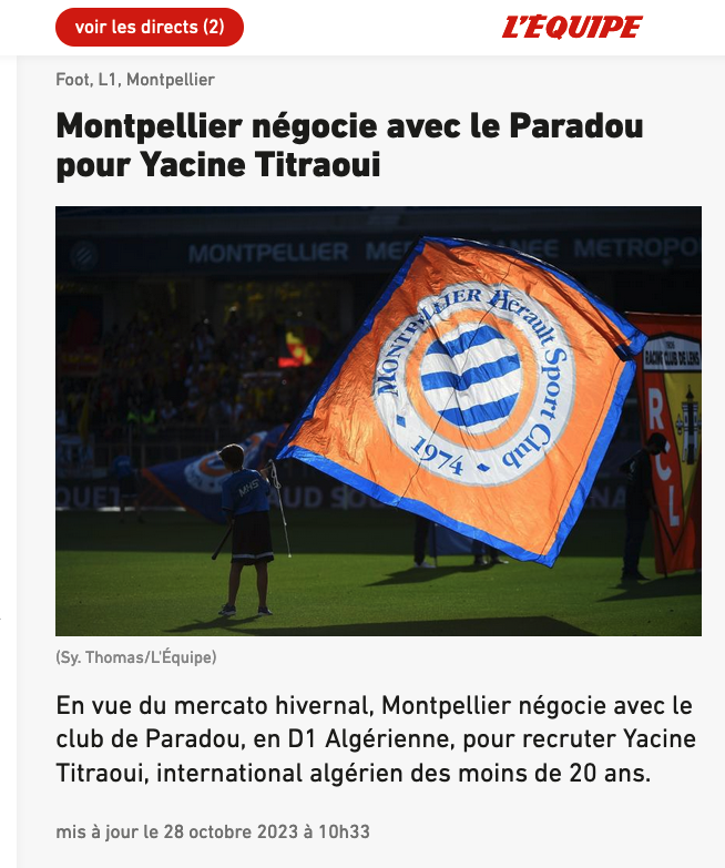 كشفت مصادر صحفية ان نادي مونبوليي الفرنسي يسعى لضم الدولي الجزائري لاقل من 20 سنة ياسين تيطراوي لاعب نادي بارادو… وحسب المصادر فان ادارة مونبوليي دخلت في مفاوضات مع نادي بارادو بشأن اللاعب تيطراوي الذي مازال عقده مع بارادو ساري المفعول الى غاية 2026.. واكدت المصادر ايضا ان الصفقة ستبلغ 800 اورو لكن الناديين لم يتفقا بعد بشان عائدات بيع اللاعب مستقبلا..