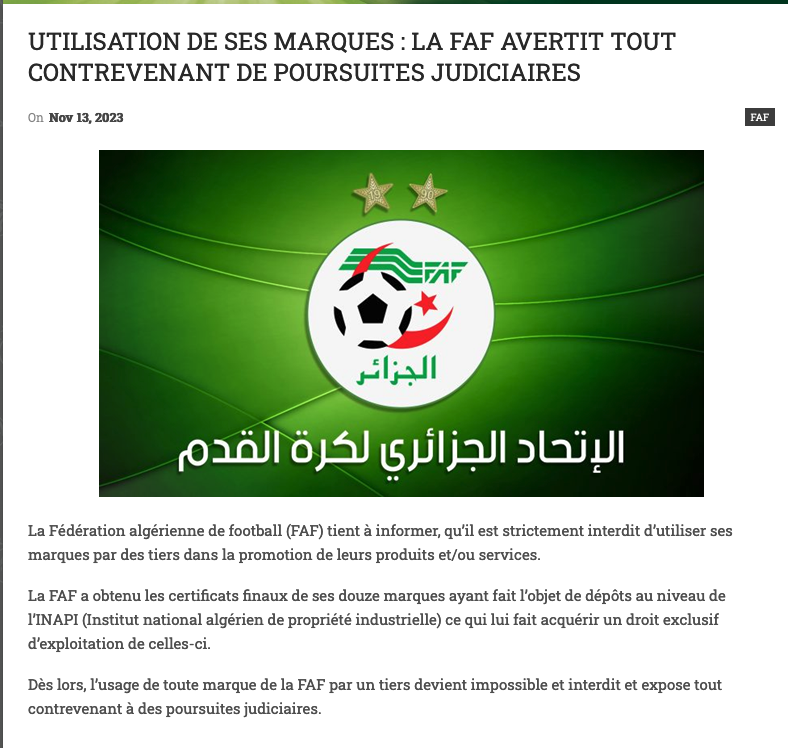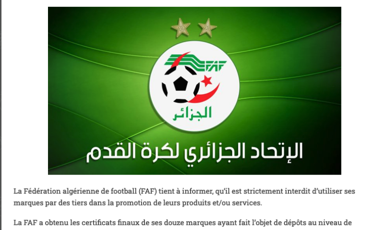 ذكر الاتحاد الجزائري لكرة القدم بأنه يمنع منعا باتا استخدام علاماته التجارية من قبل أي طرف في الترويج لمنتجاته أو خدماته