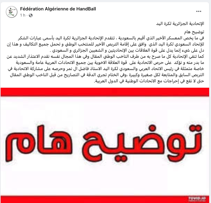 كما تقدمت اتحادية كرة اليد بالشكر الجزيل للاتحاد السعودي لكرة اليد: ” تتقدم الاتحادية الجزائرية لكرة اليد بأسمى عبارات الشكر للإتحاد السعودي لكرة اليد، الذي وافق على إقامة التربص الأخير للمنتخب الوطني وتحمل جميع التكاليف”.