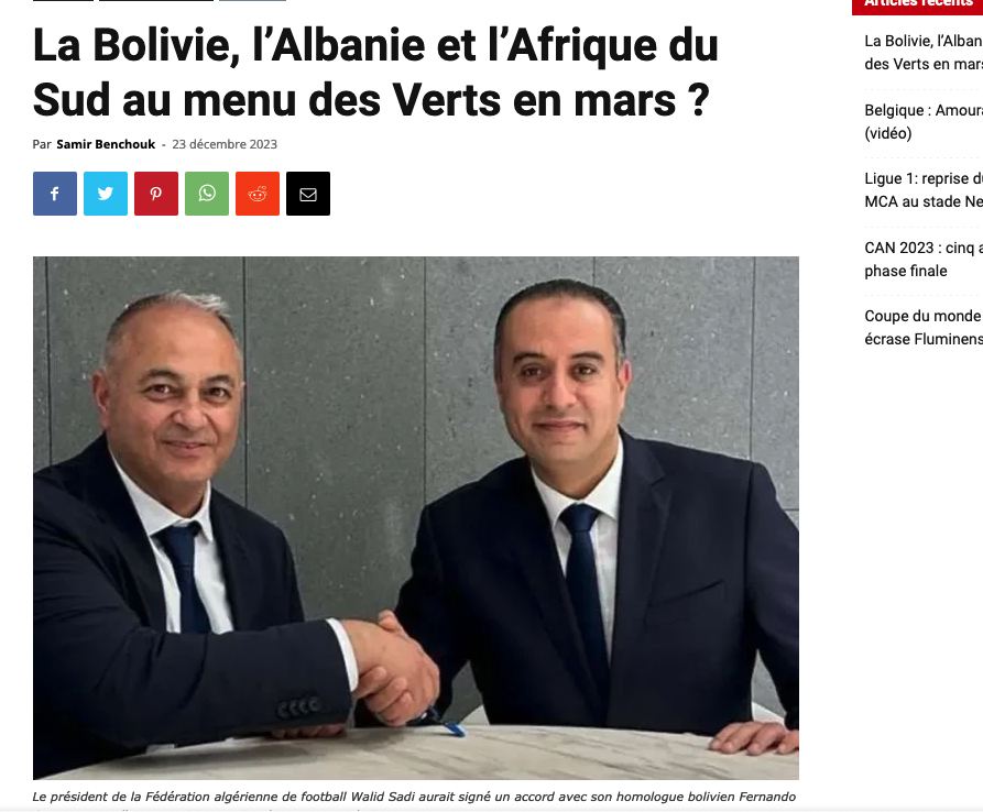 ذات المصادر البوليفية أكدت أنه تم التوصل إلى هذا الاتفاق يوم الجمعة في جدة بالمملكة العربية السعودية، حيث أقيمت كأس العالم للأندية، والتي حضرها رئيس الاتحاد البوليفي لكرة القدم فرناندو كوستا الذي وقع الاتفاق مع رئيس الفاف مع وليد صادي، وسيتم الإعلان عن تواريخ وأوقات المباريات خلال الأيام القليلة القادمة، ويحتل منتخب بوليفيا حاليا المركز رقم 85 في تصنيف الفيفا، في حين يحتل منتخب الجزائر المركز 30، وألبانيا المركز 62، وجنوب إفريقيا المركز 66.