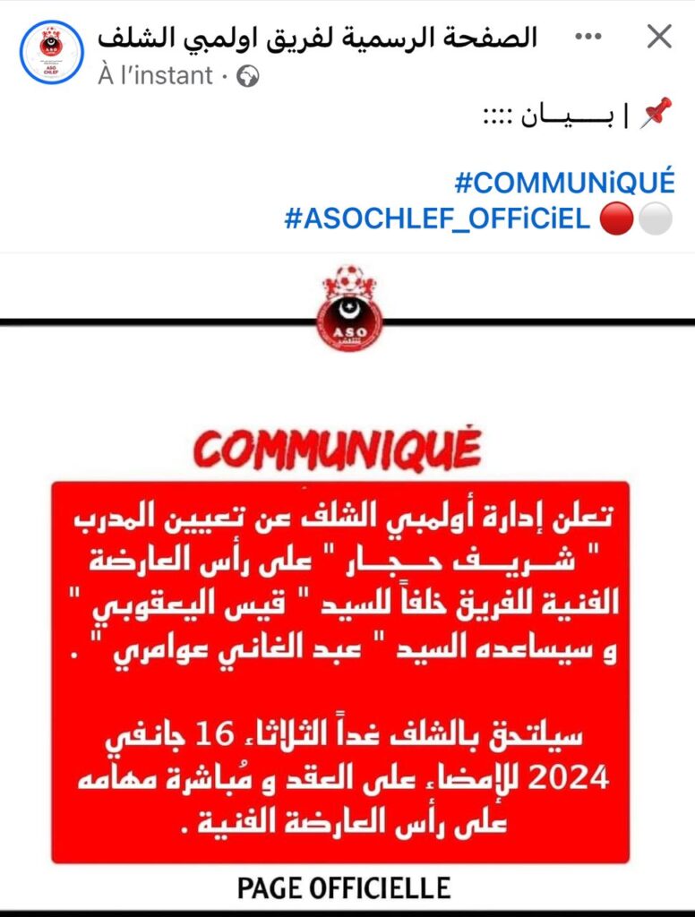 أعلنت إدارة جمعية الشلف تعيين المدرب شريف حجار مدربا جديدا للفريق، خلفا للمدرب التونسي المستقل قيس اليعقوبي، والذي غادر الفريق بسبب توالي النتائج السلبية، هذا وسيبدأ المدرب الجديد شريف حجار في عمله الثلاثاء تحضيرا لمباراة شباب بلوزداد المقررة الجمعة، ضمن الجولة الرابعة عشر من الرابطة المحترفة
