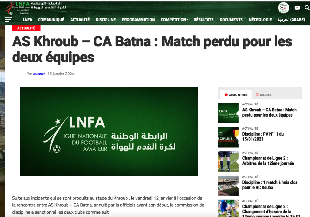 قررت لجنة الانضباط التابعة لرابطة الهواة معاقبة فريقي جمعية الخروب وشباب باتنة، وقررت لجنة الانضباط خسارة المباراة بالنسبة للفريقين وذلك بعدما تم إلغاؤها سابقا من قبل الرسميين بسبب أحداث شغب نشبت بين أنصار الفريقين، وعاقبت رابطة الهواة فريقين جمعية الخروب وشباب باتنة بخسارة اللقاء، إضافة لعقوبة الحرمان من الجماهير لمباراتين لكل منهما أيضا، وغرامة مالية بـ 90 ألف دينار لكل ناد، وفي المقابل عاقبت ذات اللجنة أندية رائد القبة، شبيبة تيارت وترجي مستغانم بالاستقبال دون جمهور في لقاء واحد.