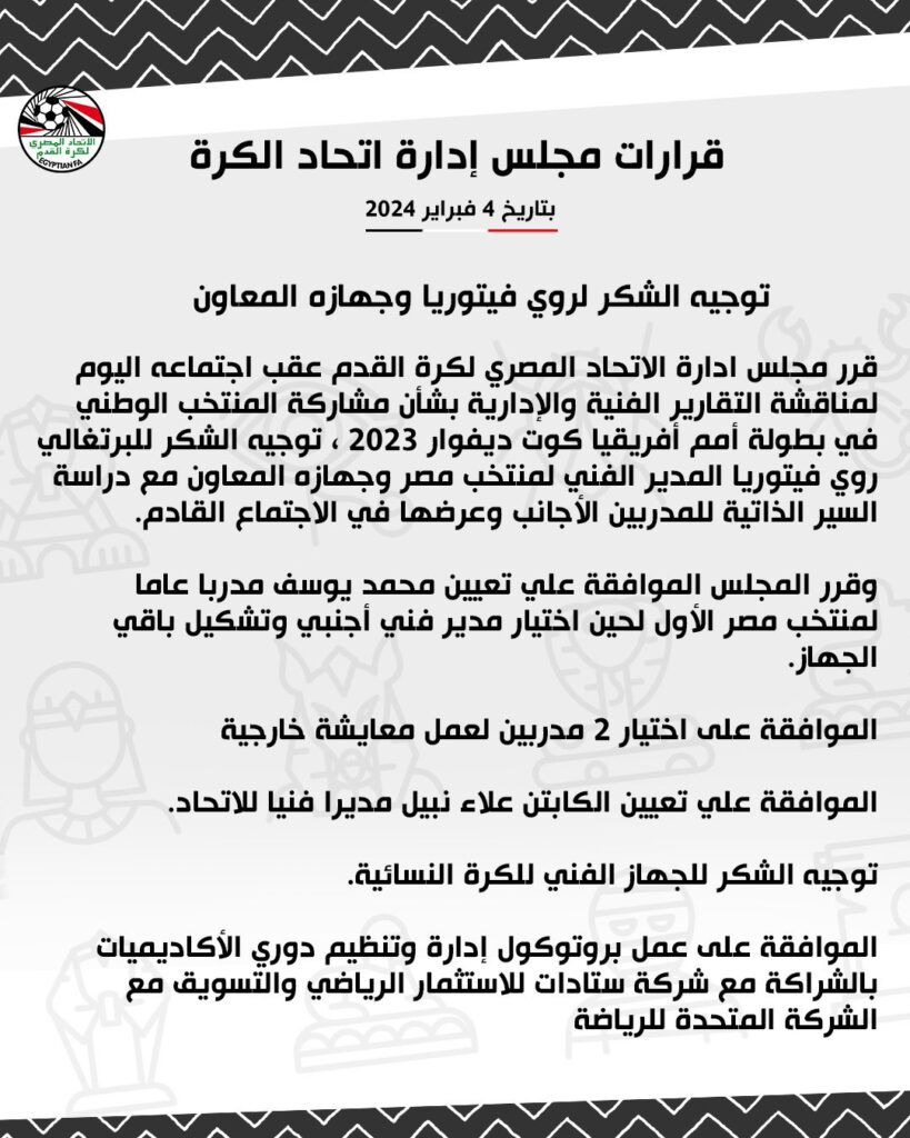 قرر الإتحاد المصري لكرة القدم وبشكل رسمي إقالة المدرب روي فيتوريا عقب الإجتماع الذي جمع الأحد المدرب ورئيس الاتحادية لمناقشة التقارير الفنية والإدارية بشان مشاركة المنتخب المصري في كأس أمم إفريقيا، وأكد الإتحاد المصري في بيانه رحيل المدرب روي فيتوريا بعد الاتفاق على الطلاق بالتراضي، وتم تعيين محمد يوسف مدربا رئيسيا لمنتخب مصريا، إلى حين اختيار مدير فني أجنبي وتشكل باقي الطاقم الفني.
