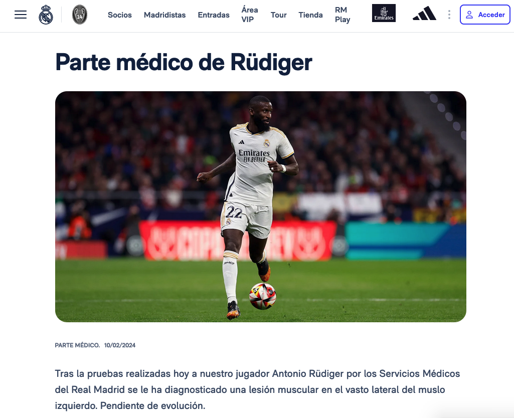 اعلن ريال مدريد عن إصابة مدافع الفريق انطونيو روديغر … وجاء في بيان ريال مدريد انه وبعد الفحوصات التي أجراها الطاقم الطبي في ريال مدريد تم تشخيص إصابة روديغر في عضلات الفخذ الأيسر..  وكان انشيلوتي مدرب الريال قد أعلن سابقا تواجد روديغر في قائمة الفريق لمواجهة جيرونا السبت ليخرج اللاعب من القائمة بشكل رسمي… وحسب مصادر اعلامية فان روديغر سيغيب عن مباريات أخرى أبرزها مباراة رابطة أبطال أوروبا ضد لايبزيغ.