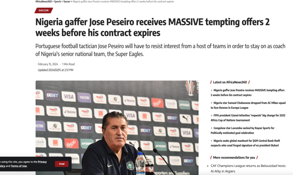 أفادت تقارير إعلامية نيجيرية، أن مستقبل المدرب البرتغالي “جوزي بيسيرو” على رأس العارضة الفنية لمنتخب نيجيريا، سيتحدد هذا الأسبوع، وذلك خلال اجتماع من المنتظر أن يعقده وزيره الرياضة النيجيري، مع مسؤولي الاتحادية، وهذا في ظل مطالبة المدرب السابق للمنتخب السعودي، بمستحقاته المالية العالقة، إذ يأمل المدرب السابق لـ سبورتينغ لشبونة، الحصول أولا على مستحقاته المالية، قبل الحسم في مسألة بقائه أو رحيله، في الوقت الذي أكد مصادر إعلامية برتغالية، أن “بيسيرو”، وفضلا عن تواجده محل اهتمام الاتحادية الجزائرية، فإنه يوجد أيضا محل اهتمام اتحادات أخرى وأندية لم تكشف صحيفة “أجوغو” البرتغالية عن هويتها.
