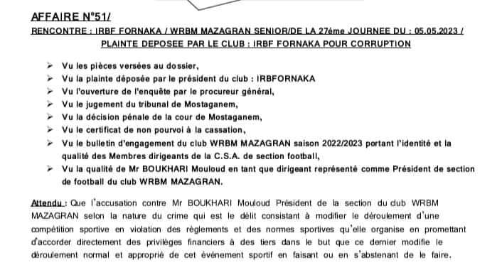 تم رسميا اسقاط فريق وفاق مزغران من القسم الجهوي الثاني لرابطة وهران الى القسم ما قبل الشرفي لرابطة مستغانم بقرار من رابطة مستغانم، وذلك بعد قرار من محكمة مستغانم مؤيد من مجلس القضاء يورط رئيسه في قضية رشوة لترتيب مقابلة في الموسم الماضي أين لعب الفريق في شرفي مستغانم.