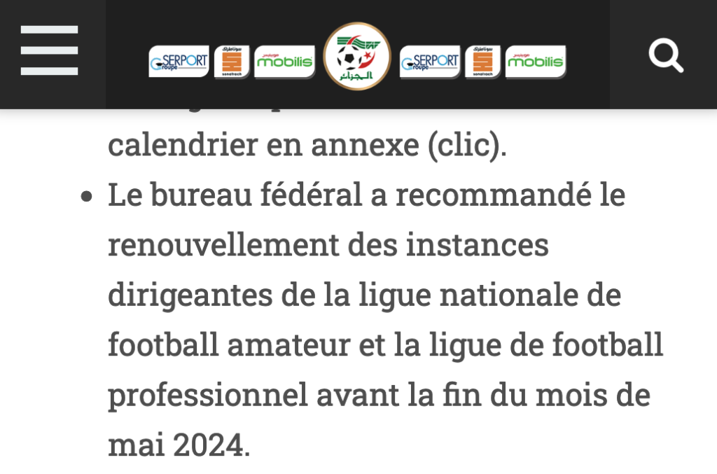 واشار بيان المكتب الفيدرالي أشار أيضا فيما يخص الرابطتين المحترفة والهواة وأكد على أنه سيتم إجراء إنتخابات لتحديد الرئيس القادم لكلا الرابطتين خلفا لكل من عبد الكريم مدوار وكذا علي مالك وذلك قبل نهاية شهر ماي من سنة 2024 .. وفي النهاية أكد بيان الإتحادية بأنه تقرر رسميا إيقاف رئيس رابطة عنابة الجهوية لكرة القدم « عمار بهلول » بعد الخروقات المالية التي وجدها المحققون الداخليون والخارجيون في طريقة تسيير الرابطة الجهوية لعنابة.