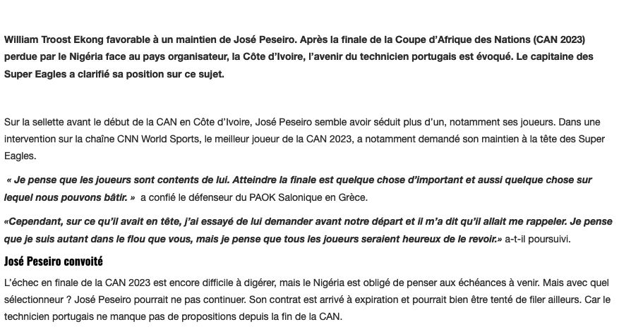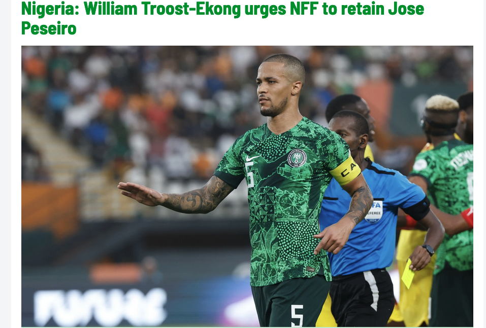 دعا قائد منتخب نيجيريا “وليام أيكونغ” في تصريحات إعلامية أدلى بها الخميس، دعا القائمين على شؤون كرة القدم النيجيرية، لتجديد عقد المدرب البرتغالي “جوزي بيسيرو”، وأكد مدافع “باوك سالونيكا” اليوناني، إن غالبية لاعبي منتخب نيجيريا، يرحبون باستمرار “بيسيرو” على رأس العارضة الفنية بعد العمل الجيد الذي قام به، ونجاحه في قيادة منتخب النسور لبلوغ نهائي “الكان” وخسارته أمام كوت ديفوار، يحدث هذا في الوقت الذي أكدت مصادر إعلامية نيجيرية، إن الاتحاد المحلي لكرة القدم، لم يفصل بعد في موضوع تجديد عقد المدرب البرتغالي، بما أنه ينتظر الضوء الأخضر من السلطات من أجل الحسم في مستقبل المدرب السابق لمنتخب “فنزويلا”، الذين يطالب بالحصول على مستحقاته المالية، وزيادة راتبه الشهري مقابل التوقيع على عقد جديد يمتد إلى غاية 2026، وهذا موازاة مع تواجده محل اهتمام الاتحادية الجزائرية لخلافة جمال بلماضي.
