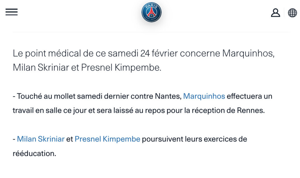 سيغيب مدافع وقائد باريس سان جيرمان ماركينيوس عن مواجهة رين الأحد في الدوري بسبب الاصابة.. وجاء في بيان باريس سان جيرمان ان ماريكينوس سيغيب عن لقاء الاحد… بسبب اصابة في ربلة ساقه تعرض لها السبت الماضي ضد نانت… فيما يواصل سكرينيار وكيمبيمبي عملية التأهيل.. ويحتل باريس سان جيرمان صدارة الدوري الفرنسي بـ 53 نقطة من 22 مباراة.
