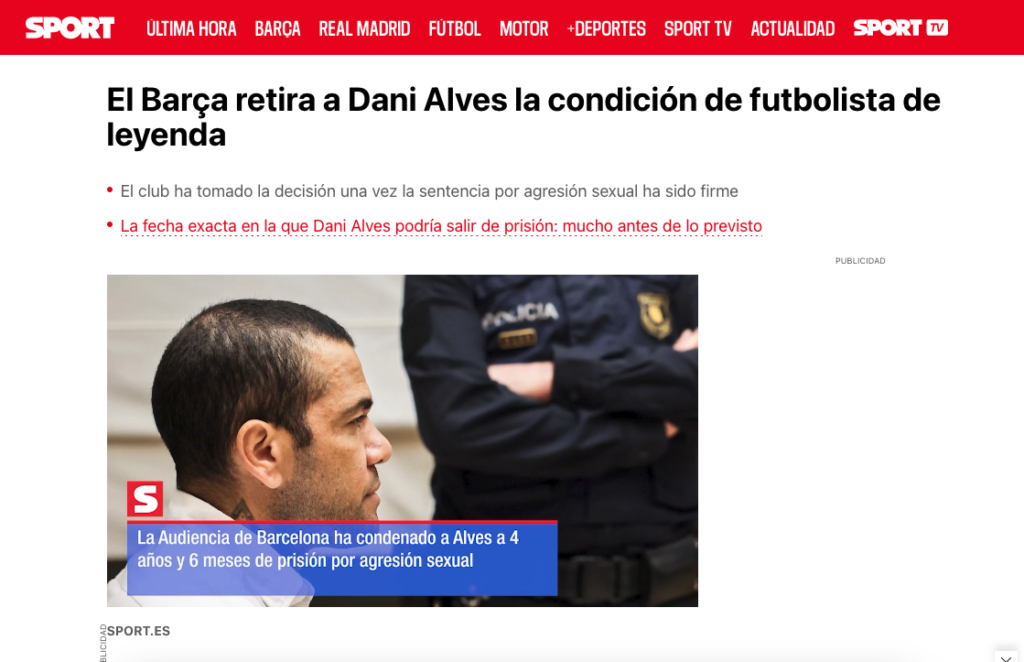 قرّر نادي برشلونة اتخاذ إجراءات قاسية في حق لاعبه السابق البرازيلي داني ألفيش، عقب إدانته رسميا من قبل القضاء الإسباني بتهمة الاعتداء، و ذكرت صحيفة “سبورت” الإسبانية أن إدارة برشلونة قرّرت إزالة اسم ألفيش من قائمة أساطير النادي، والتي تضم 102 لاعبا، وأكدت “سبورت” في تقريرها أن إدارة الفريق الكتالوني كانت حذرة للغاية في قرارها، على أمل أن يحصل ألفيش على البراءة، وبمجرد صدور الحكم على البرازيلي تم تفعيل القرار، ويعتبر ألفيش من أبرز لاعبي الجيل الذهبي للفريق الكتالوني، إذ شارك في أكثر من 408 مباراة، حقق خلالهم ثلاثة ألقاب دوري أبطال أوروبا، وستة ألقاب دوري إسباني، والعديد من البطولات الأخرى.