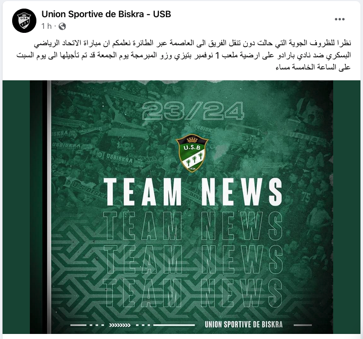 أقدمت الرابطة المحترفة لكرة القدم على تأجيل مباراة نادي بارادو أمام الضيف اتحاد بسكرة برسم الجولة 19 من الرابطة المحرتفة الأولى… أقدمت على تأجيلها إلى السبت على الساعة الخامسة بعدما كانت مبرمجة الجمعة بملعب اول نوفمبر بتيزي وزو… وياتي هذا التأجيل بسبب رداءة الظروف الجوية التي حالت دون تنقل وفد اتحاد بسكرة عبر الطائرة إلى العاصمة…