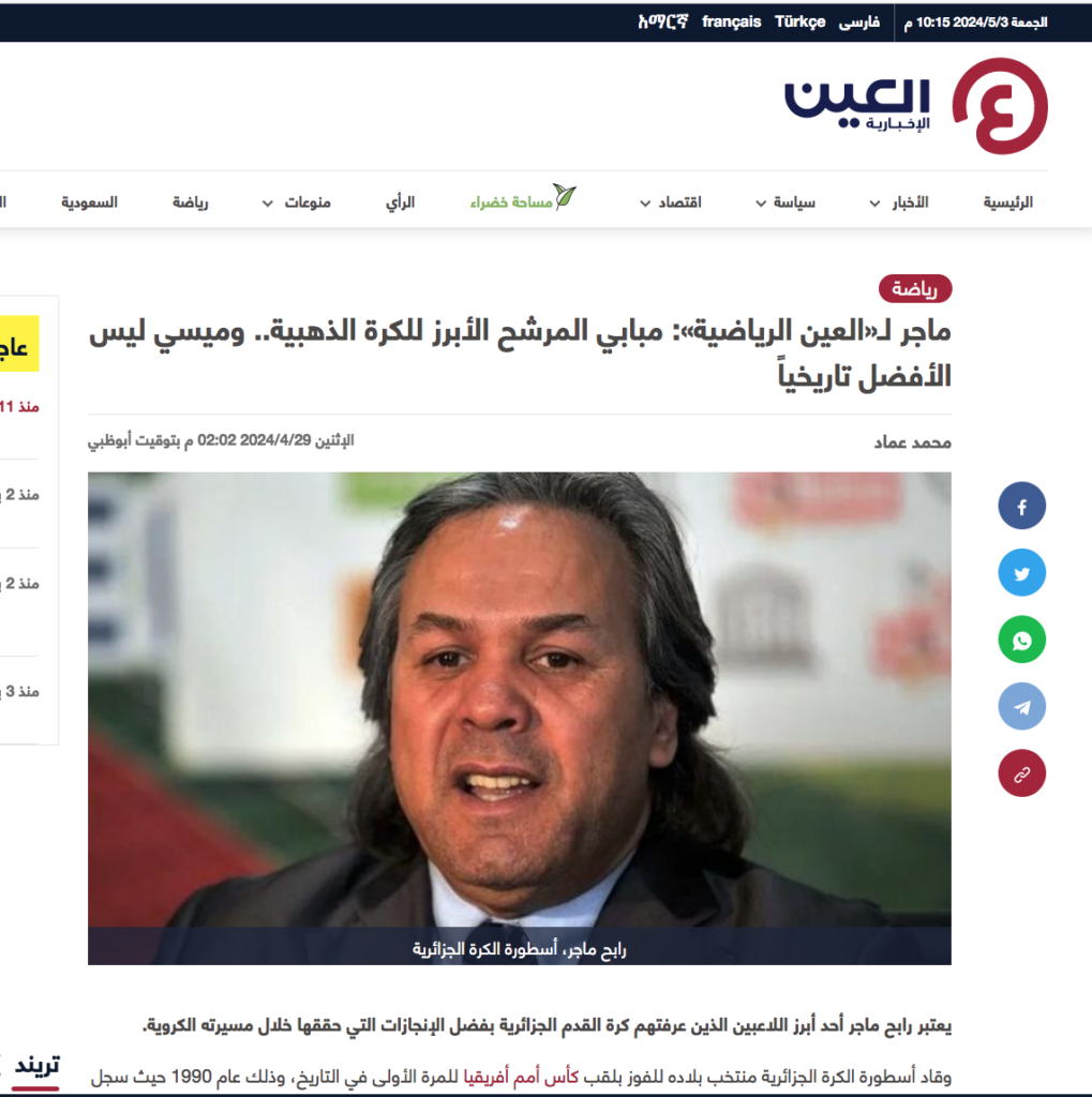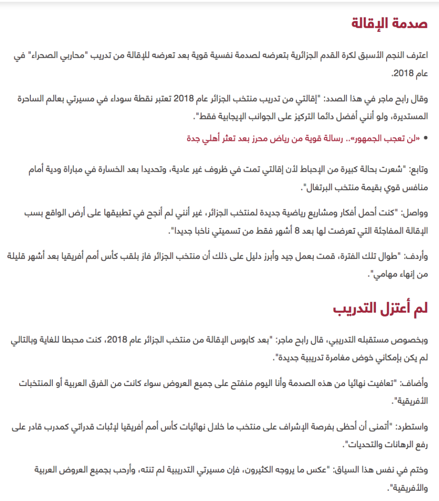 عاد أسطورة كرة القدم الجزائرية الحية رابح ماجر، في حوار خص به موقع “العين الإماراتي”، عاد إلى فترة إشرافه على المنتخب الوطني في 2018، وإقالته عقب الانهزام في ودية البرتغال، وهي الاقالة التي قال أسطورة نادي بورتو البرتغالي، أنها حزت في نفسه كثيرا، بدليل إنه اعتبرها في حواره، بمثابة النقطة السوداء في مشواره، مؤكدا تعرض للظلم، بسبب الطريقة التي أقيل بها، خاصة بعد العمل الجيد الذي قام به مع المنتخب حسبه، وإسهامه بشكل مباشرة بعدها في التتويج التاريخي بكأس إفريقيا 2019، واستغل أيقونة كرة القدم الجزائرية المناسبة، لنفي أنباء اعتزاله ميادين التدريب، بإبداء استعداده للإشراف على أي فريق أو منتخب يطلب خدماته، خاصا بالذكر المنتخبات الإفريقية، التي يحلم بقيادتها في نهائيات كأس أمم إفريقيا لإثبات قدراته وحنكته في التدريب، كما تحسر أول لاعب عربي يتوج بلقب دوري أبطال أوروبا، عن فشل صفقة انتقاله إلى نادي انتير ميلان، مؤكدا توقيعه على عقد مبدئي لثلاثة مواسم مع النادي الإيطالي، لكن الصفقة فشلت في آخر لحظة، بسبب تعرضه لتمزق عضلي، وقال ماجر إن الأسطورة الإيطالي “تراباتوني” هو من تكفل باقناعه بالتوقيع في الانتير، لكن القدر حرمه من لقب أول لاعب إفريقي يحترف في إيطاليا.