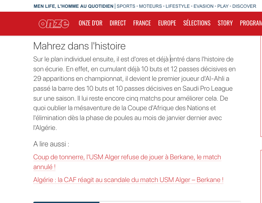 أثبت الدولي الجزائري وقائد المنتخب الوطني معدنه الغالي، لما تمكن من تدوين اسمه في السجل التاريخي لنادي الأهلي السعودي، في أول موسم له في البطولة السعودية، وهذا بعدما أصبح رياض محرز أول لاعب في تاريخ نادي الأهلي، يتمكن من تسجيل 10 أهداف وتقديم 10 تمريرات حاسمة في موسم واحد في تاريخ النادي الأهلي، ليواصل محرز كتابة مجده التليد، بعد معجزته في إنجلترا مع ليستر سيتي، و ثلاثيته التاريخية مع مانشستر سيتي، والنجمة الإفريقية مع المنتخب الوطني، وتمكن محرز بفضل أرقامه من تأكيد أنه أحد أفضل لاعب الدوري السعودي لهذا الموسم، وليس فقط فريقه الأهلي، رغم سيل الجارف من الانتقادات الذي يتعرض له في كل مرة.