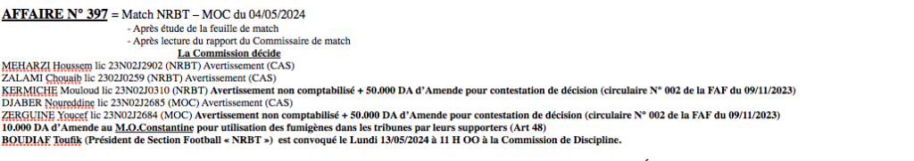 لجنة الإنضباط تعاقب نصر حسين داي بلقاءين دون جمهور