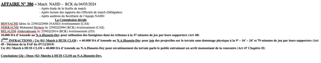 أصدرت لجنة الانضباط التابعة لرابطة الهواة… عقوباتها من مخلفات الجولة 25… وتمت معاقبة نصر حسبين داي بلقاءين دون جمهور بسبب اقتحام الأنصار للميدان خلال لقاء الداربي أمام رائد القبة والتسبب في توقف مؤقت للمقابلة فضلا عن رمي الألعاب النارية والمقذوفات….كما استدعت اللجنة رئيس نادي التلاغمة توفيق بوضياف للاستماع لأقواله في جلسة الإثنين المقبل.