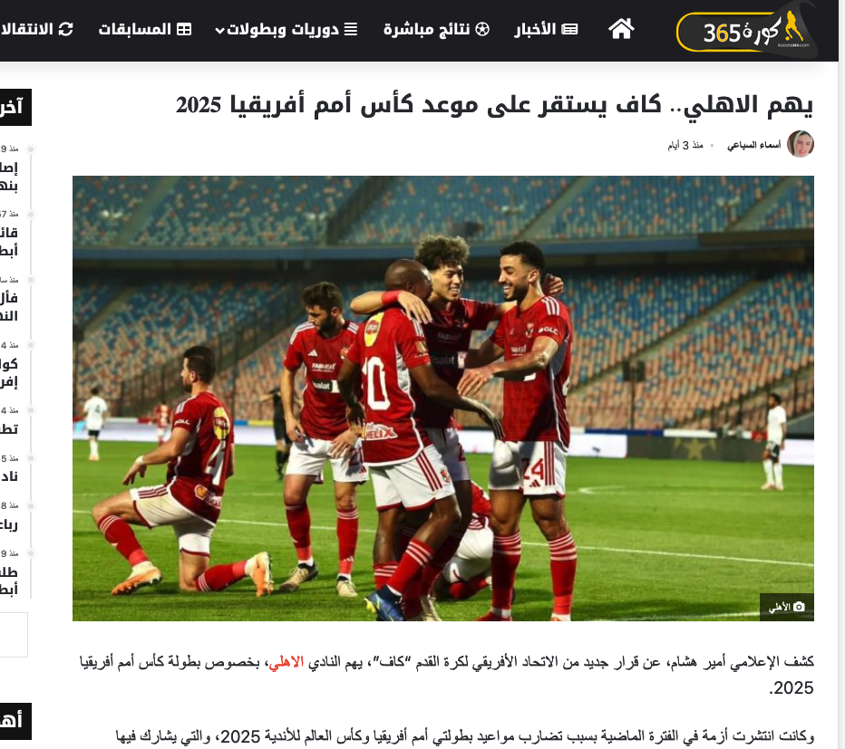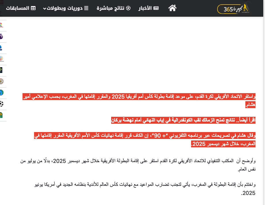 وافقت اللجنة الفنية للاتحاد الإفريقي لكرة القدم على تعديل موعد انطلاق بطولة كأس الأمم الإفريقية في طبعتها الـ 35، لتقام في ديسمبر 2025 بدلا من الموعد المبدئي الذي كان محددا في جوان، بحسب ما أكدته الأهرام المصرية الأربعاء. حتى لا تتعارض مع النسخة الأولى من كأس العالم للأندية بشكلها الجديد..