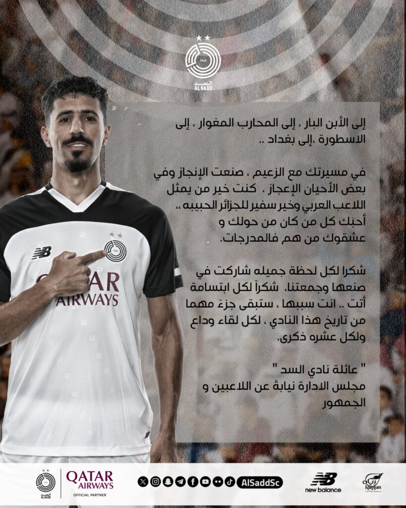 أعلن نادي السد القطري رحيل هدافه التاريخي الدولي الجزائري بغداد بونجاح بعد 9 مواسم قضاها في الزعيم القطري… سجل فيها أكثر من 200 هدف وأسهم في تتويج الفريق بـ 18 لقبا محليا… وودع نادي السد نياية عن الإدارة والجمهور… ودع الهداف الجزائري برسالة مؤثرة جاء فيها: “إلى الإبن البار… إلى المحارب المغوار… إلى الأسطورة بغداد…