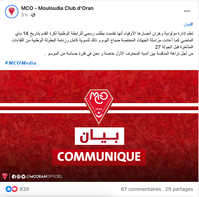 كشفت إدارة مولودية وهران في بيان لها يوم الأحد أنها تقدمت بطلب رسمي للرابطة المحترفة من أجل تسوية جميع اللقاءات المتأخرة عن الموسم الجاري، قبل برمجة لقاءات الجولة الـ 27 من البطولة المحترفة، وكشفت الإدارة الوهرانية، بأنها تقدمت بطلب رسمي إلى الرابطة الوطنية بتاريخ 14 ماي الجاري بخصوص ذات الطلب، ويصارع فريق الباهية وهران السقوط هذا الموسم في الرابطة المحترفة الأولى إذ يحتل الفريق المركز ما قبل الأخير في البطولة.