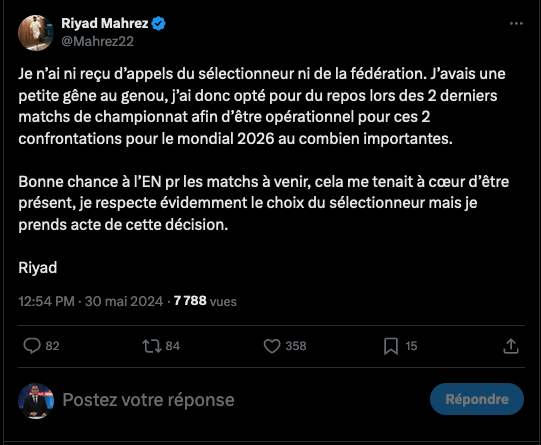 رد رياض محرز على ما قاله الناخب الوطني فلاديمير بيتكوفيتش ونفى رفضه تلبيه دعوة المنتخب الوطني، وقال محرز في تغريدة نشرها عبر موقع التواصل الاجتماعي “X” أنه لم يتلق لا اتصالا هاتفيا من المدرب ولا الاتحادية، وأضاف محرز أنه كانت لديه إصابة خفيفة في الركبة وفضل الركون للراحة مع فريقه الأهلي ليكون تحت تصرف بيتكوفيتش في مباراتي شهر جوان ضمن تصفيات المونديال، في إشارة إلى أنه لم يرفض المنتخب كما أكده بيتكوفيتش، وفي الأخير تمنى محرز التوفيق للمنتخب الوطني مؤكدا أنه يحترم قرارات المدرب.