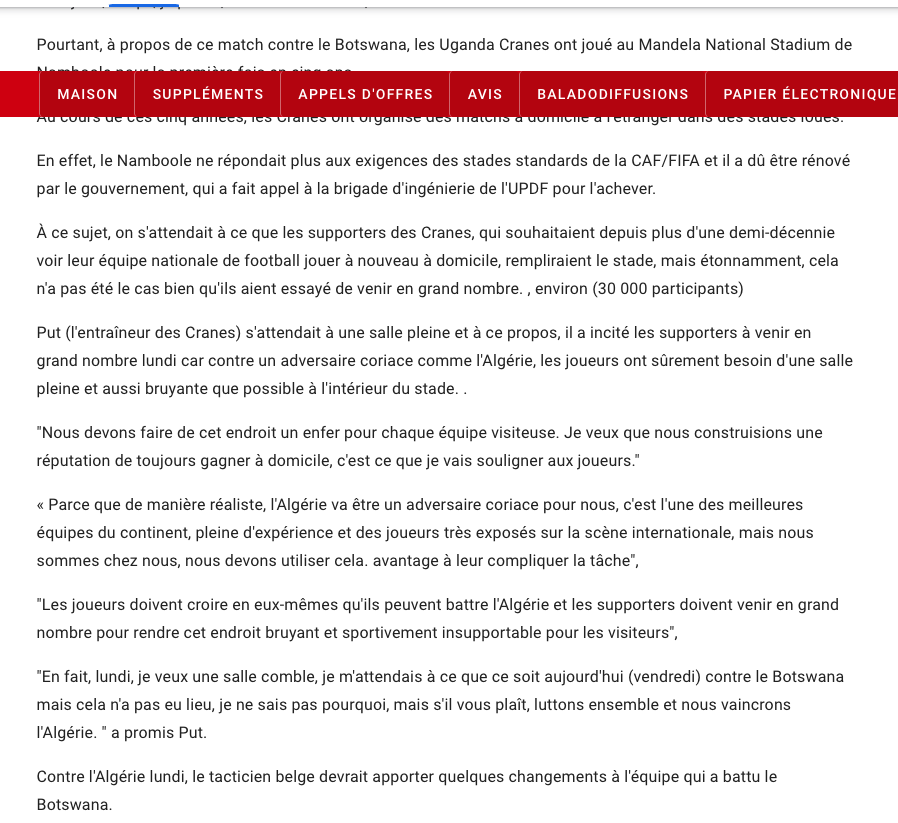 توعد البلجيكي مدرب المنتخب الأوغندي، البلجيكي “بول بوت”، المنتخب الوطني، لما أكد في الندوة الصحفية التي نشطها عقب نهاية مباراة “بوتسوانا”، على تحقيق الفوز أمام الخضر، بأي طريقة ممكنة، موجها رسالة قوية للجماهير الأوغندية، التي طالبها بالحضور بقوة، إلى مدرجات ملعب “نيسلون مانديلا “ بالعاصمة “كامبلا” من أجل مساعدة أشباله على تحقيق الفوز، ورغم اعتراف المدرب السابق لاتحاد العاصمة بقوة المنتخب الوطني، إلا أنه أكد على قدرة أشباله على إحداث المفاجأة وتحقيق الفوز، مركزا في تصريحاته، على دعم الأنصار، الذين طالبهم البلجيكي، بضرورة الحضور بأعداد قياسية، لممارسة الضغط على كتيبة المدرب “بيتكوفيتش”، وأكد بول بوت، أن الفوز أمام المنتخب الجزائر، لن يخلط فقط حسابات المجموعة السابعة، بل سيعزز آمال منتخب أوغندا في الظفر بتأشيرة التأهل لكأس العالم، لأول مرة في تاريخه.