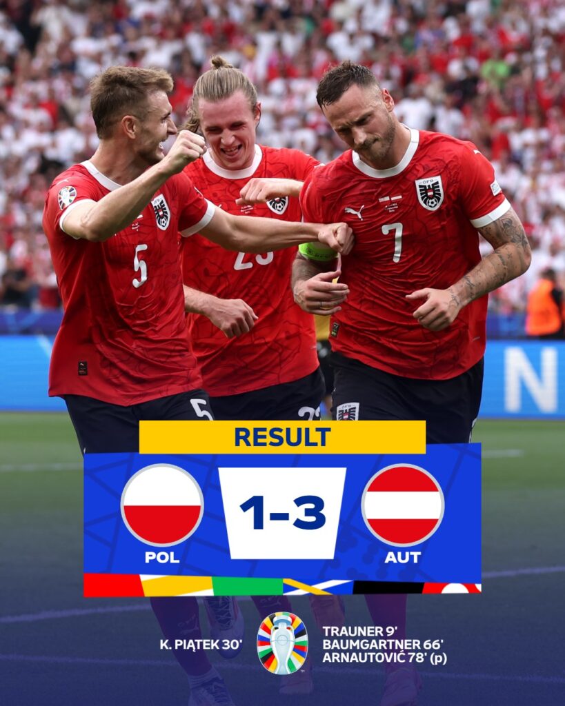 حقق منتخب النمسا فوزا ثمينا على حساب نظيره البولندي بثلاثة أهداف لهدف في المباراة التي جمع المنتخبين مساء الجمعة ضمن فعاليات الجولة الثانية من المجموعة الرابعة لبطولة أمم أوروبا الجارية بألمانيا… المدافع جيرنو تراونر خطف هدف التقدم للنمسا في الدقيقة 9 برأسية قوية وفي الدقيقة ٣٠ تمكن البولندي كريستوف بياتيك من تسجيل هدف التعادل… وفي الدقيقة 67 سجلت النمسا الهدف الثاني عبر كريستوف باومغا رتنر ثم سجل ماركو أرناتوفيتش الثالث في الدقيقة 78 عبر من ركلة جزاء.