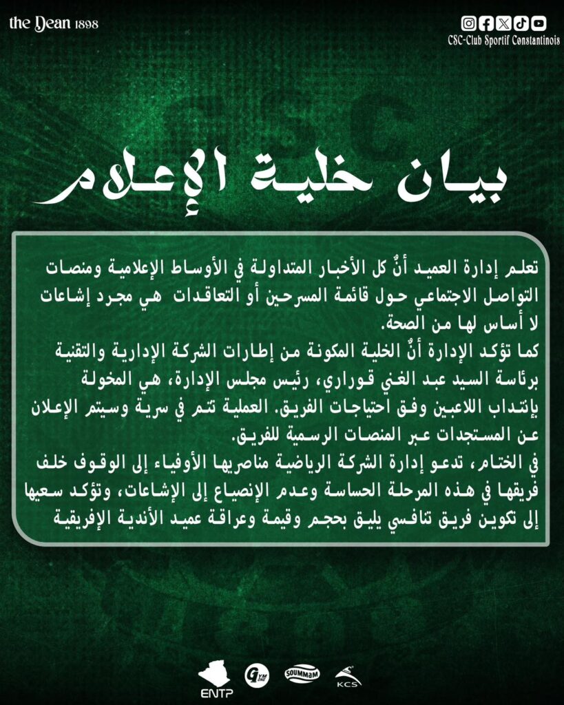 نفت إدارة نادي شباب قسنطينة، الشائعات التي يتم تداولها مؤخرا بخصوص مستجدات الفريق، كما وجهة رسالة مباشرة لأنصار النادي… ونشرت إدارة شباب قسنطينة بيان عبر الصفحة الرسمية للفريق، نفت من خلال كل الأخبار المتداولة بخصوص قائمة المسرحين، او التعاقدات الصيفية كما أضاف ذات البيان بأن عملية الانتدابات تجري في سرية تامة من طرف المسؤولين الإدرايين والتقنيين للنادي، وفق احتياجات النادي.