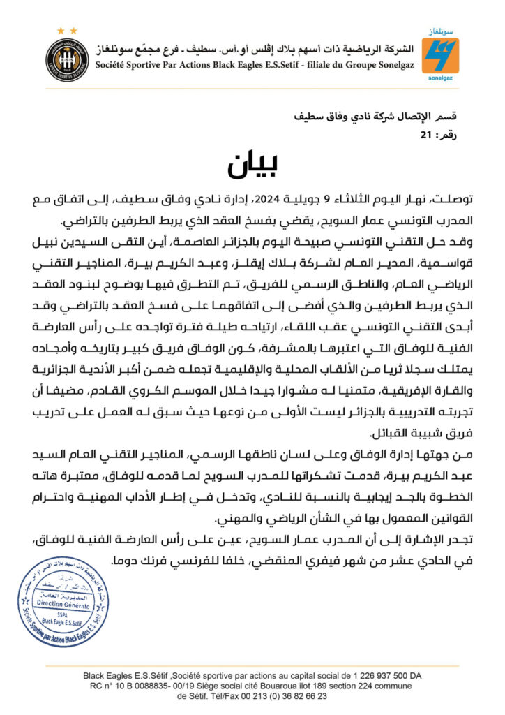 اعلنت ادارة وفاق سطيف الثلاثاء في بيان رسمي فسخ عقد المدرب عمار السويح.. وجاء في بيان الوفاق ان الادارة توصلت الى اتفاق مع السويح يقضي بفسخ العقد بالتراضي بين الطرفين