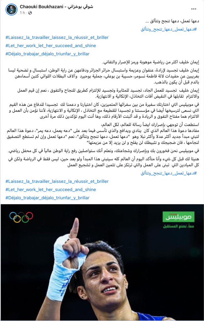 باتت إيمان خليف ضحية للتحرش الإلكتروني حول “أنوثتها”، لكن البطلة الجزائرية وجدت نفسها في قلب جدل جديد لم يهدأ، منذ فوزها على الإيطالية أنجيلا كاريني في دور الـ16 من أولمبياد باريس 2024، لكن على شبكات التواصل الاجتماعي، تلقت الرياضية موجة عارمة من الدعم من بلادها… كما دعمها المدير العام لشركة موبيليس ” شوقي بوخزاني ” عبر مواقع التواصل الإجتماعي وأطلق هاشتاق #دعها_تعمل_دعها_تنجح_وتتألق